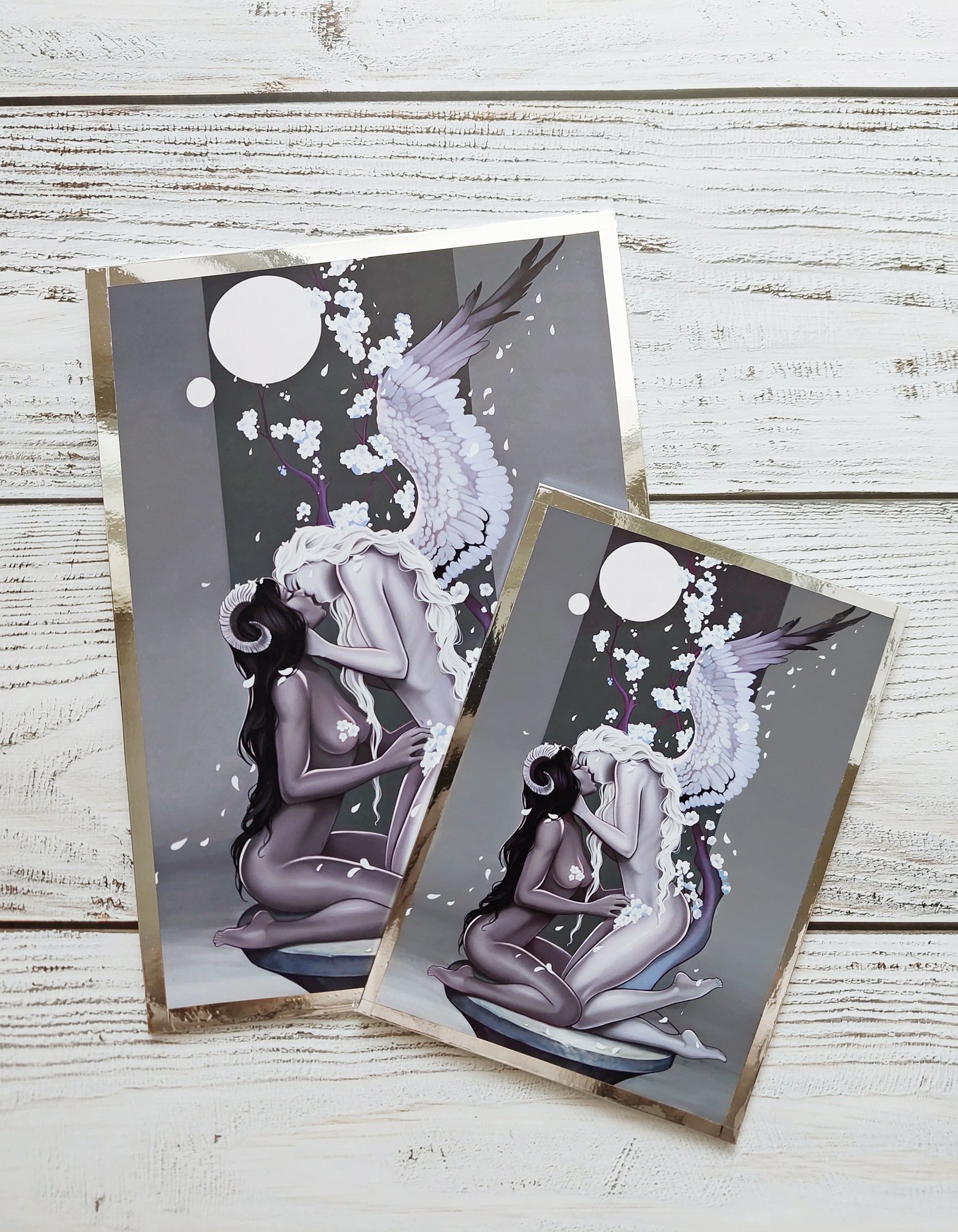 Limited edition of silver and gold framed prints.