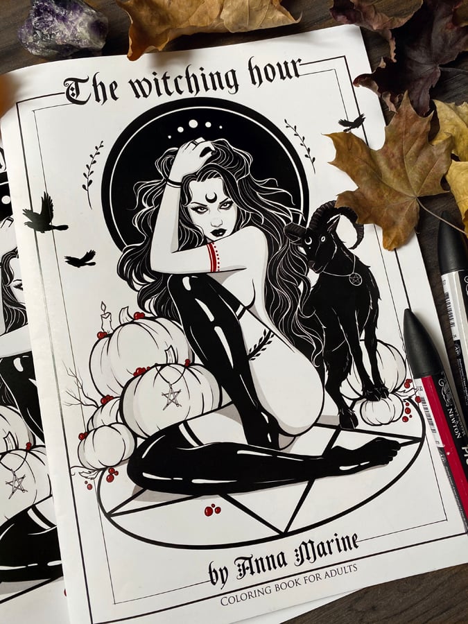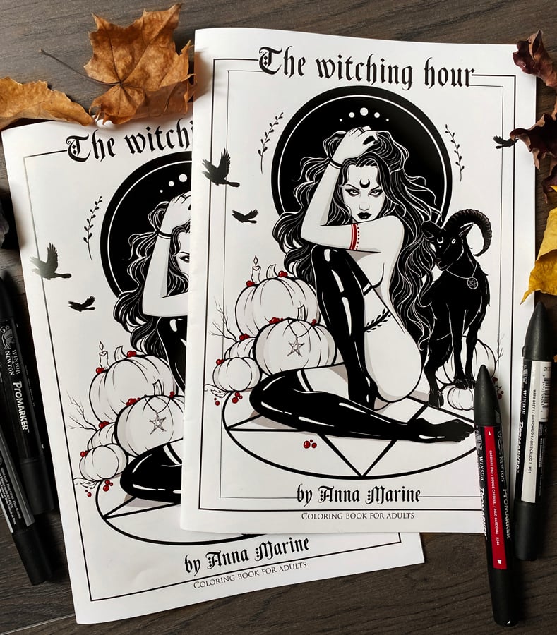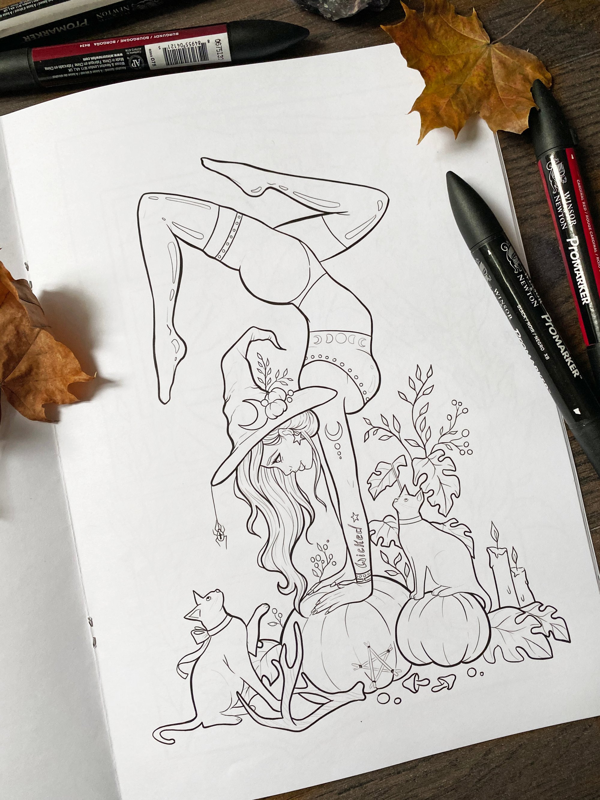 Physical book: - 16 colorable illustrations of my Inktober artworks for a total of 34 pages.